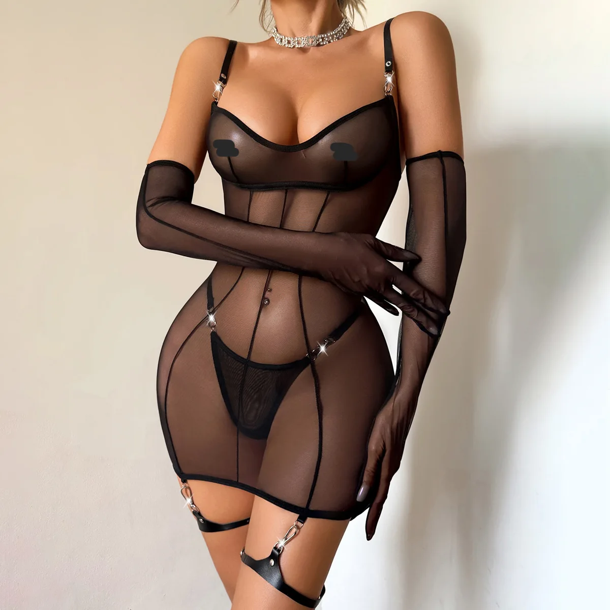 2025 Fashion High Quality New Women's Sexy Lingerie Set Hot Sales Mature See-through Mesh Bodysuit With Gloves